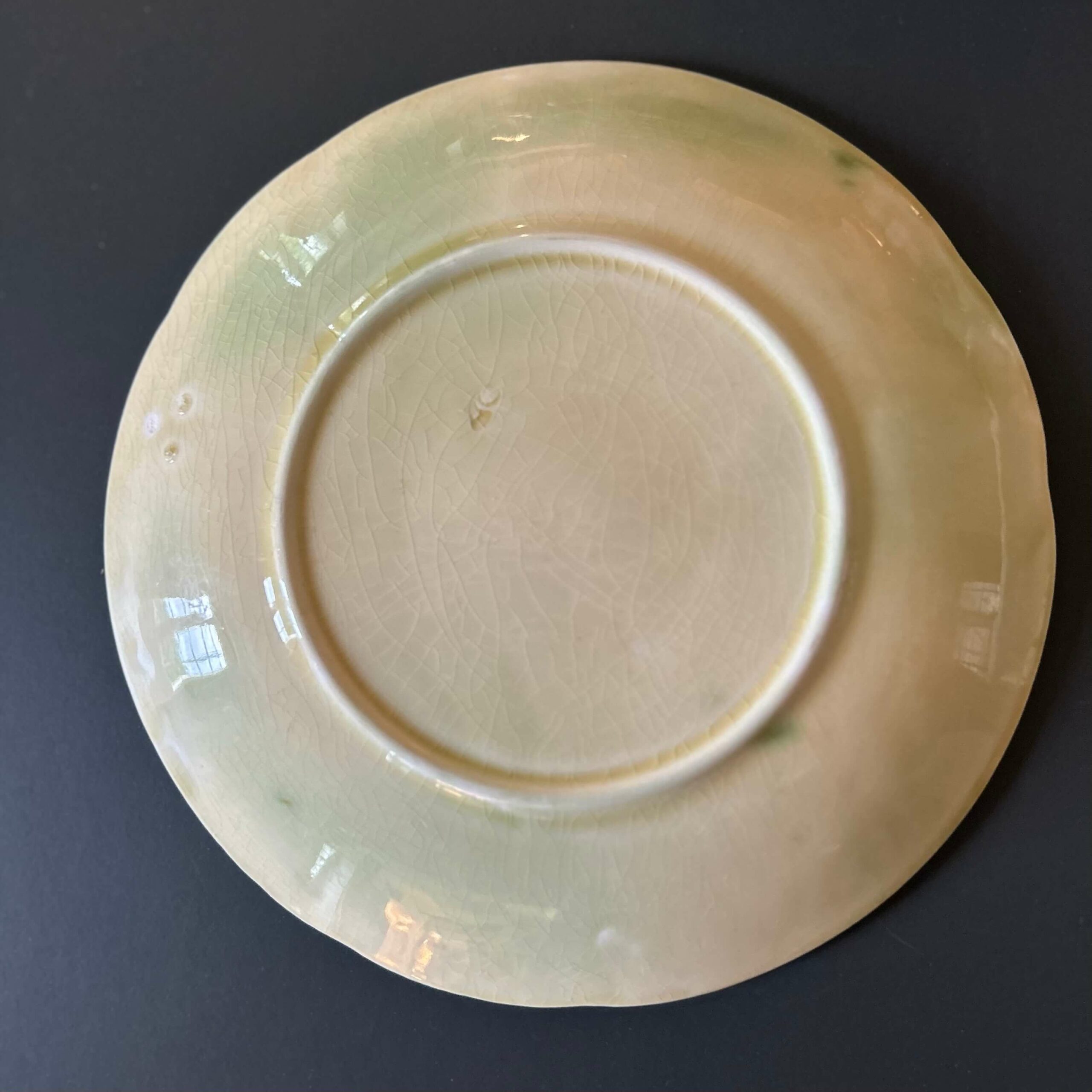 Rare série de 12 assiettes à dessert en faïence barbotine, réalisées par la manufacture d’Onnaing vers la fin du XIXe – début XXe). Chaque pièce présente un décor en relief de fraises charnues et de feuillages luxuriant, typique du goût naturaliste de l’époque. Les émaux aux tons vifs, vert tendre, rose et crème – offrent un superbe contraste et témoignent du savoir-faire des ateliers d’Onnaing, réputés pour la qualité de leurs majoliques.