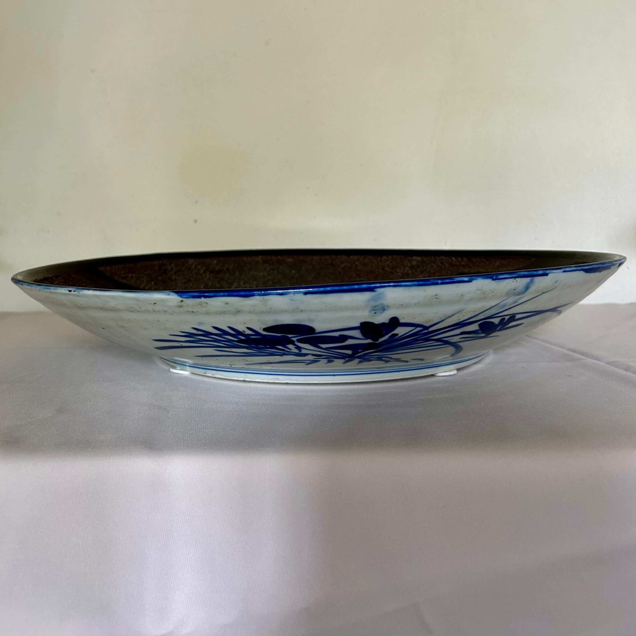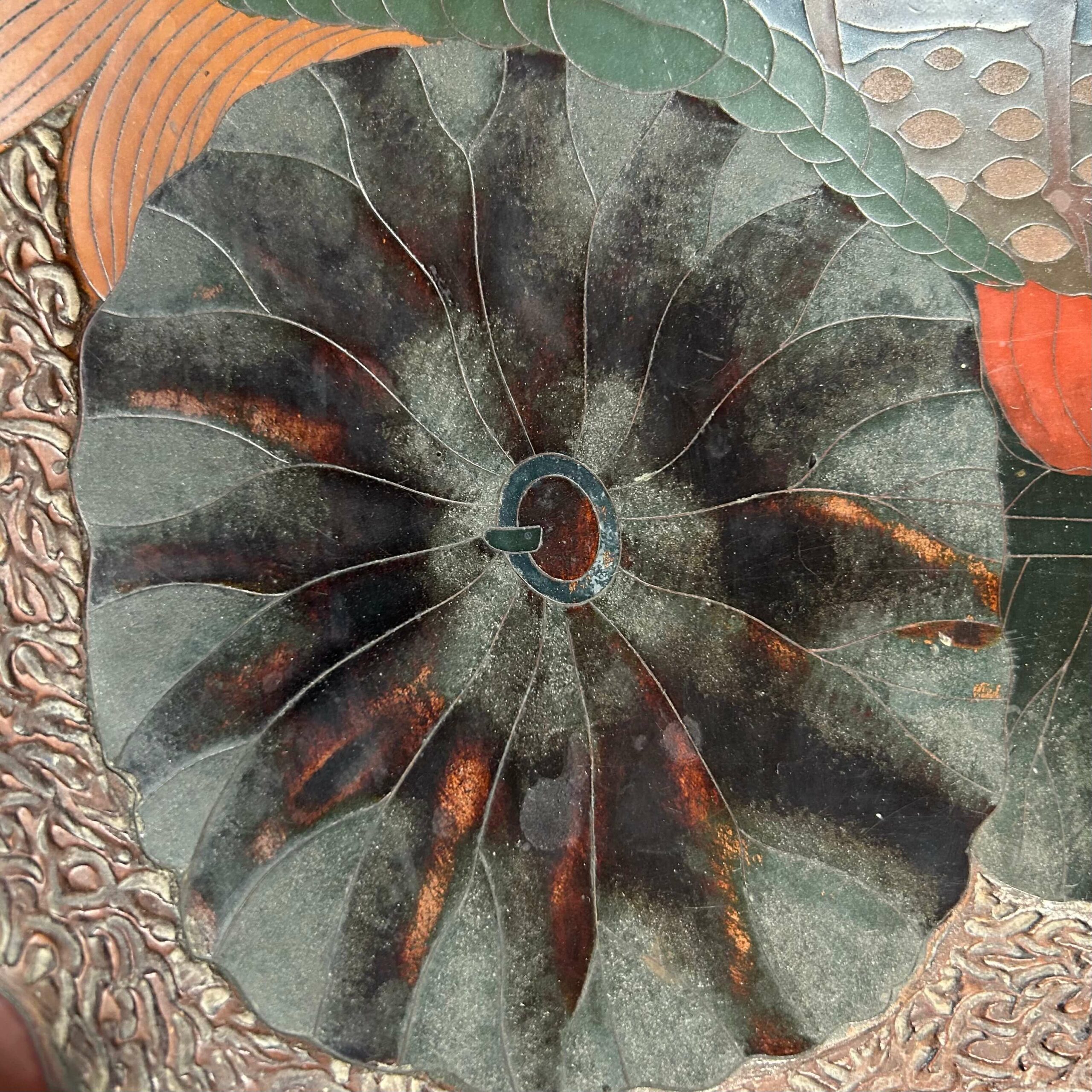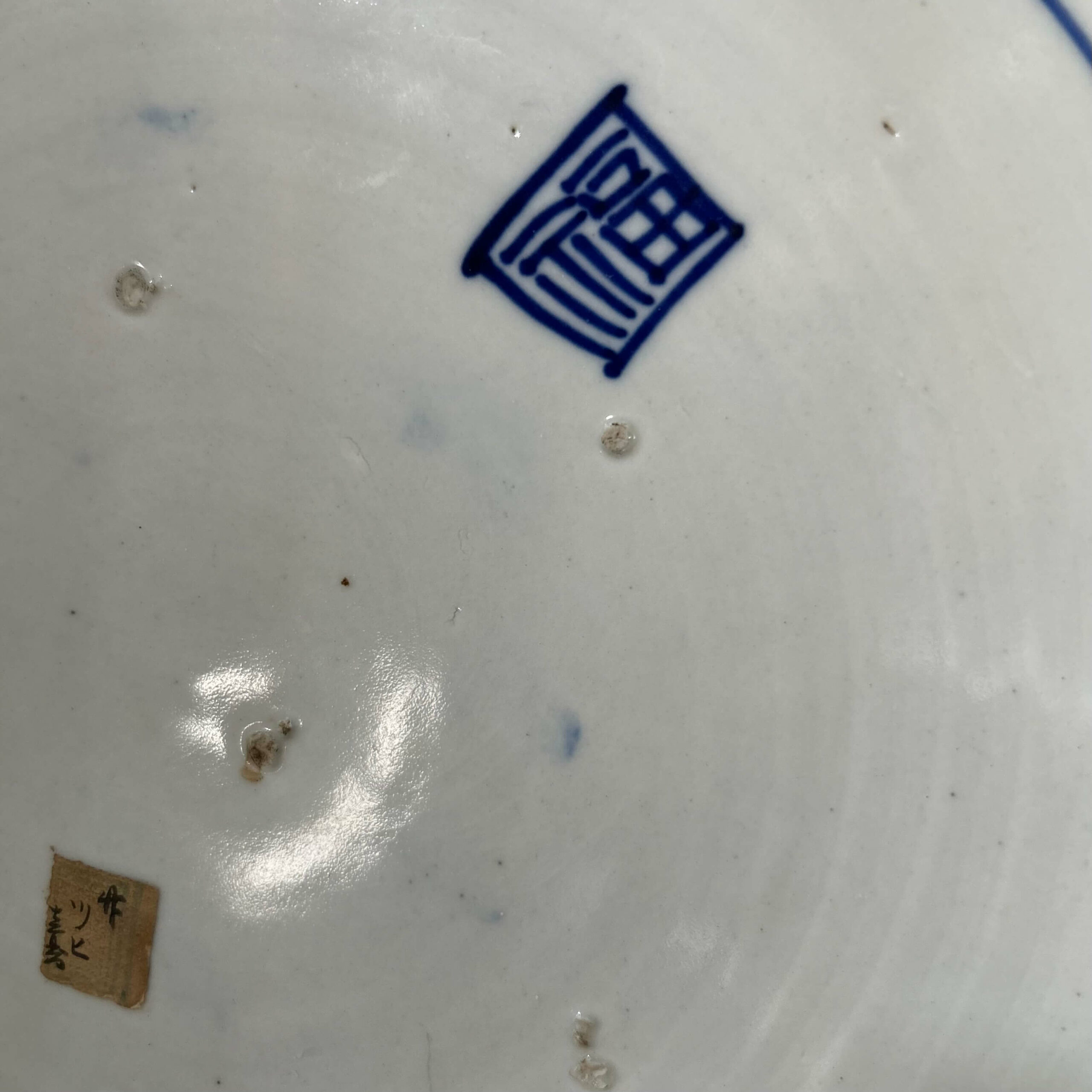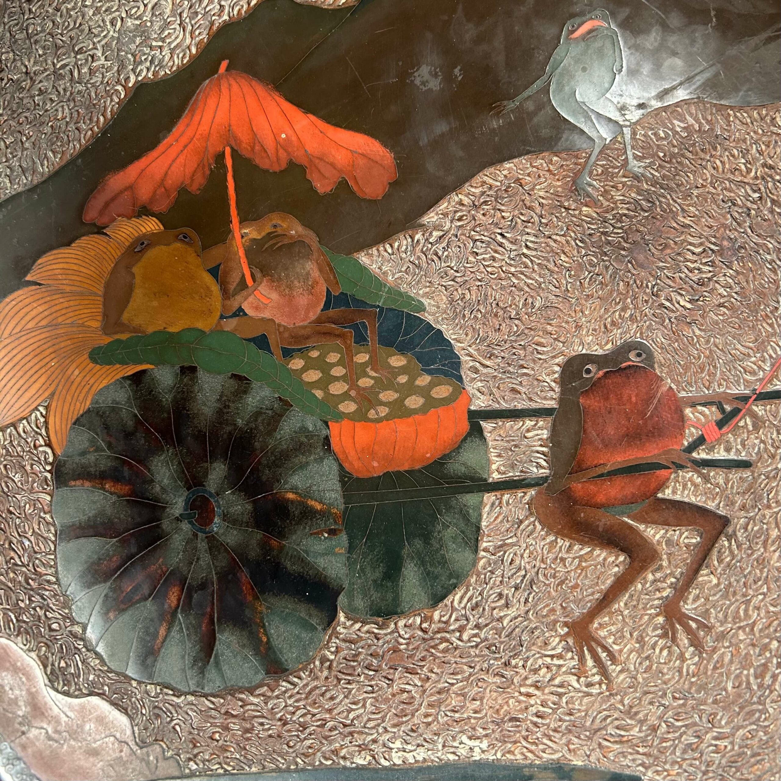 Ce grand plat japonais en porcelaine aux émaux cloisonnés, probablement de l’ère Meiji (fin XIXème – début XXème), est décoré de grenouilles anthropomorphiques tirant un char où sont assis des oiseaux sous une ombrelle. Cette scène au rendu vivant est comparable à un tableau. Elle allie des couleurs vives, sur un fond vert métallique et des personnages texturés. Les grenouilles, inspirées du Choju-giga (animaux anthropomorphes), sont symboles de bonheur dans la tradition japonaise. En effet, la grenouille, « Kaeru », signifiant le retour, est un porte bonheur pour les voyageurs car elle revient toujours de là où elle est partie. Ce décor est rare et donc recherché par les collectionneurs. Le verso du plat est en porcelaine. Il est décoré de feuillages au cobalt bleu sous couverte. Il porte un tampon bleu, marque d’un potier (Fuku, signifiant bonheur) et un petit autocollant provenant probablement d’un magasin spécialisé. Ils sont similaires à des marques japonaises de la fin du XIXème – début XXème. Ce grand plat japonais XXème à décor de grenouilles, de par sa qualité d’exécution, sa taille et sa technique de l’email cloisonné, est une belle pièce de collection très décorative.