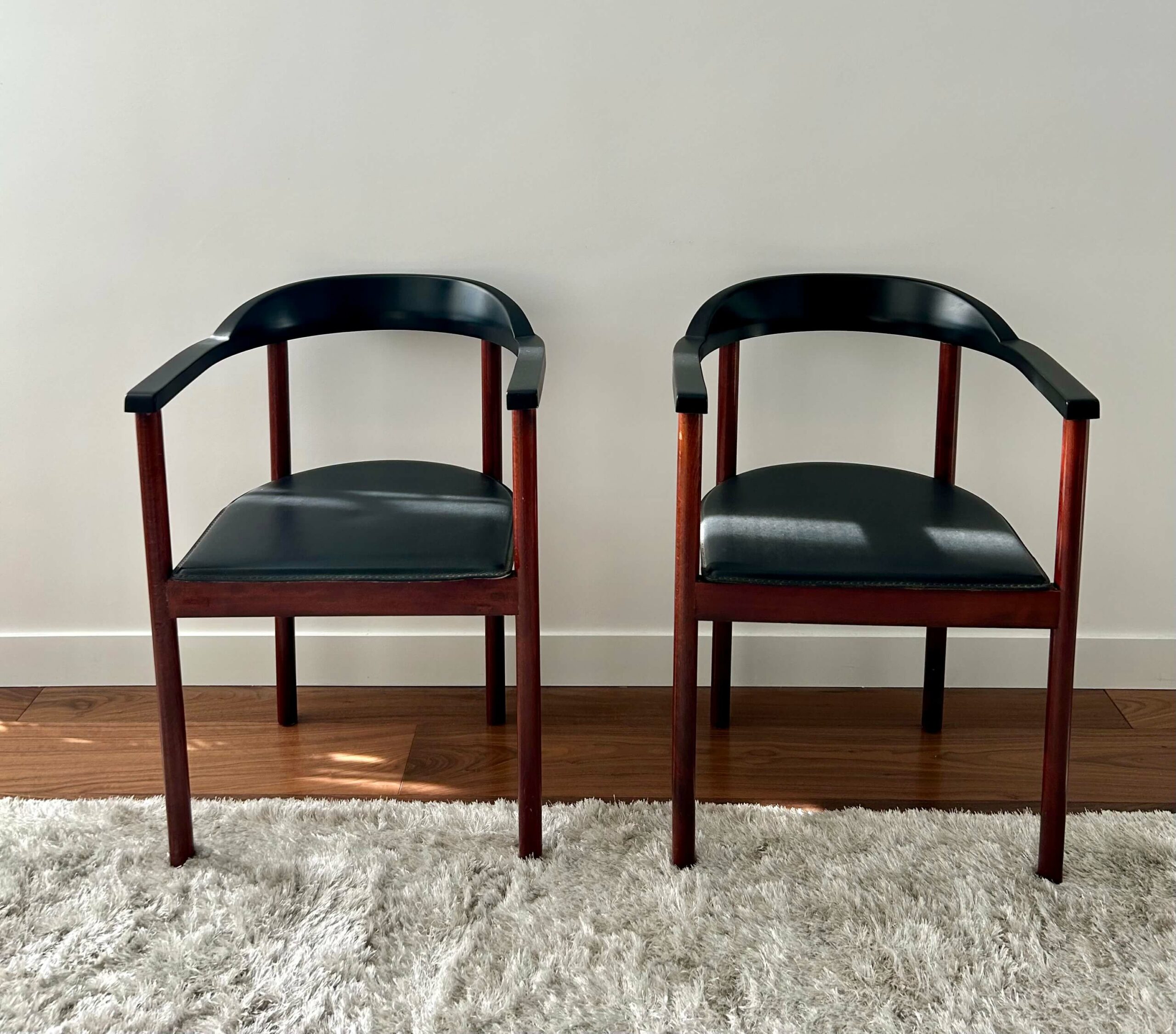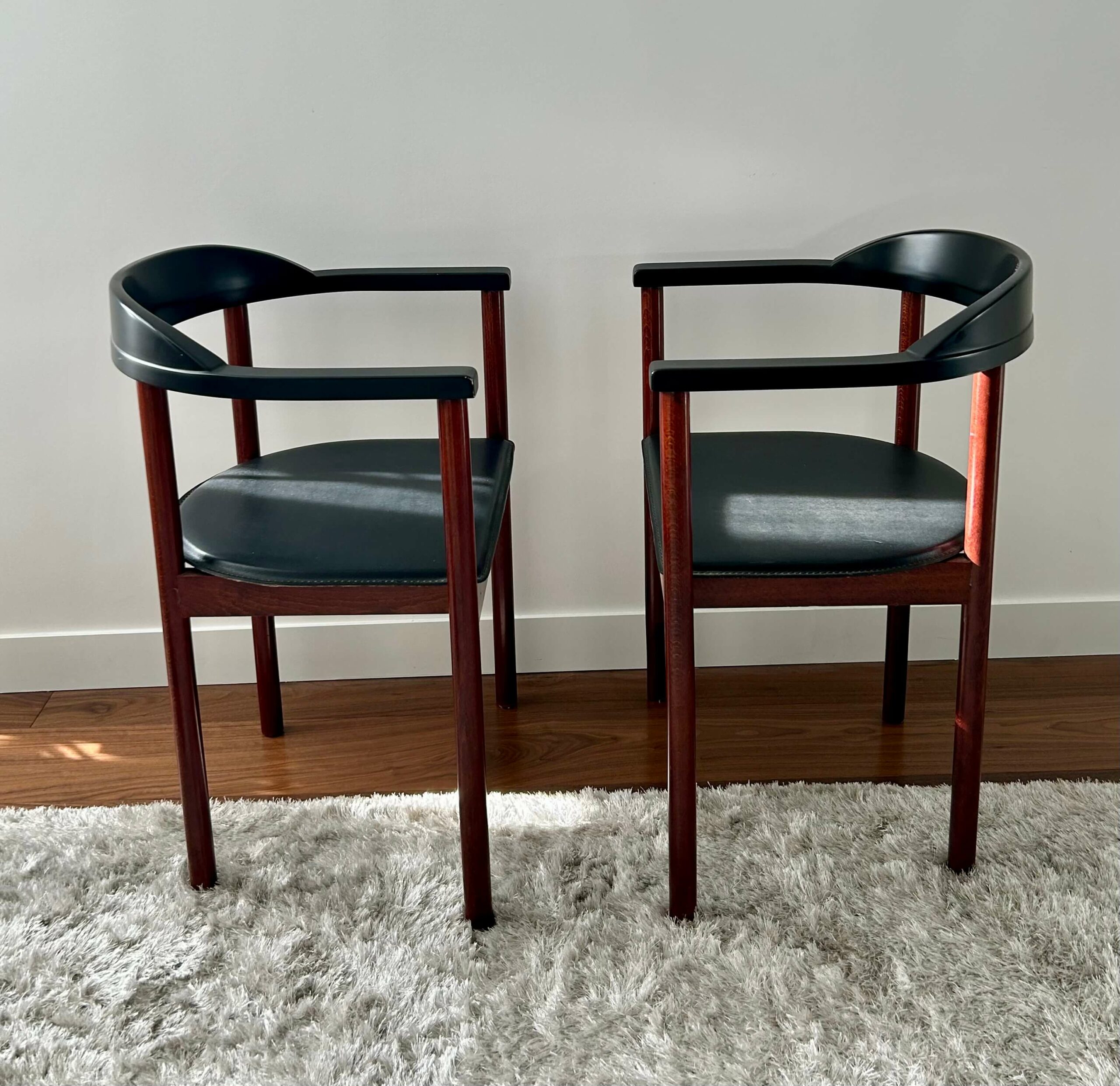 Paire de fauteuils scandinaves des années 1960 – 1970 en teck au dossier arrondi peint en laque noire et à l’assise noire en cuir.